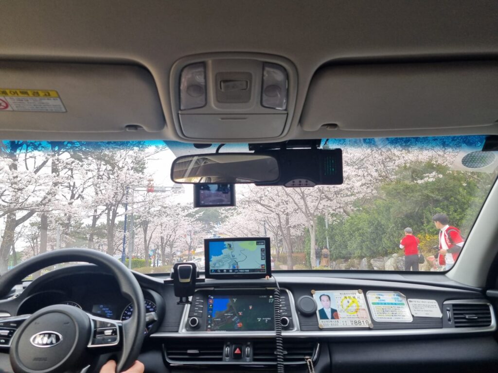 Taxi ride along a road lined with cherry trees in bloom that lead to temple.
