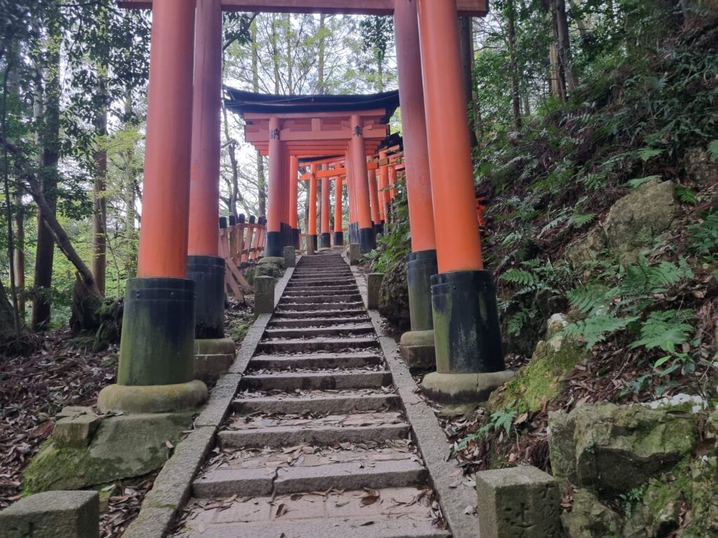 Stairs, many stairs to get to the top. The whole way has tori gates.